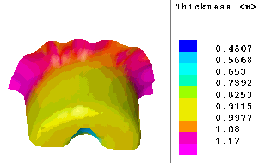 4. Többlépcsős alakítások elemzése Egy további alkalmazási terület, amelynek rövid elemzésére kitérünk, a többlépcsős képl ékenyalakítási technológiák tervezése tulajdonképpen túlmutat az eddigieken, részben a következő főpontban tárgyalandó témakörhöz is sorolható. Az ilyen, összetett technológiák tervezése ugyanis meglehetősen bonyolult, elsősorban a közbenső-, illetőleg a kiinduló geometriák meghatározása miatt. A hagyományos tervezési eljárások esetében e közbülső geometriák tervezése gyakorlati szabályokon és nagyrészt a tervező tapasztalatán és intuícióin alapul. A valamilyen jósági kritériumon alapuló automatizált geometria-tervezés tudásalapú, illetve inverz numerikus megoldást igényel. Itt két alkalmazási példát mutatunk be, amelyek esetében a numerikus elemzés elsődleges célja a már kidolgozott geometriák gyárthatóságának elemzése. Az 5.a. ábrán autó oldalpanel többlépéses alakítása, míg az 5.b. ábrán fogaskerék meleg térfogatalakításának egy közbenső lépése látható. Mindkét esetben alakváltozásokat jelenítettünk meg: egyrészt a lemezvastagság változását, illetve az alakváltozási mezőt.